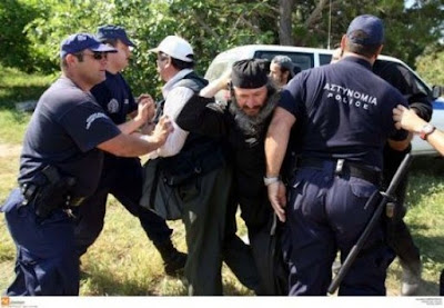 Συνεληφθη ο σεβασμιος 80ουτης γερων μοναχος Δημητριος της μονης Φιλοθεου διοτι πηγε τροφιμα στους εγκλειστους αγωνιζομενους μοναχους της Ιερας Μονης Εσφιγμενου. Ερχομενος απο τα ορια της μονης Χιλανδαριου ο Γερων Δημητριος οπου με την συνοδεια του εχουν τροφειο μελισσων παρελαβε απο την Ιερα μονη Εσφιγμενου τροφιμα για να τα μεταφερη στο Πολιορκουμενο Κονακι των Καρυων. Αφου ξεφορτωσε τα τροφιμα και ανοιξαν οι σεβασμιοι μπαρουτοκαπνισμενοι πατερες και τα παρελαβαν, αναχωρησε ο γερων και οδευε στην πλατεια των Καρυων οποτε τον πλησιασαν τρεις αστυνομικοι και ζητησαν να τους ακολουθηση στο αστυνομικο τμημα Καρυων. Εκει τον ανεκριναν τι δουλεια ειχε στο κονακι της μονης Εσφιγμενου και τι τους παρεδωσε. Και επιπλεον τον ρωτουσαν για τα φορολογικα του οτι χρωστουσε στην εφορια και αλλα τρελλα "αδικηματα" του γεροντα. Ο γερων Δημητριος αρνηθηκε οτι ειχε καποια σχεσι με τις εφοριες και στο κονακι μετεφερε για τους εγκλειστους πατερες τροφιμα. Και αν αυτο ειναι εγκλημα μπορουν να του προσαψουν την κατηγορια του ...εγκληματια. Αφου κρατησαν τον Γεροντα Δημητριο για ανακρισι περι τα τρια τεταρτα της ωρας τον αφησαν αφου ζητησαν απο αυτον συγγνωμη.